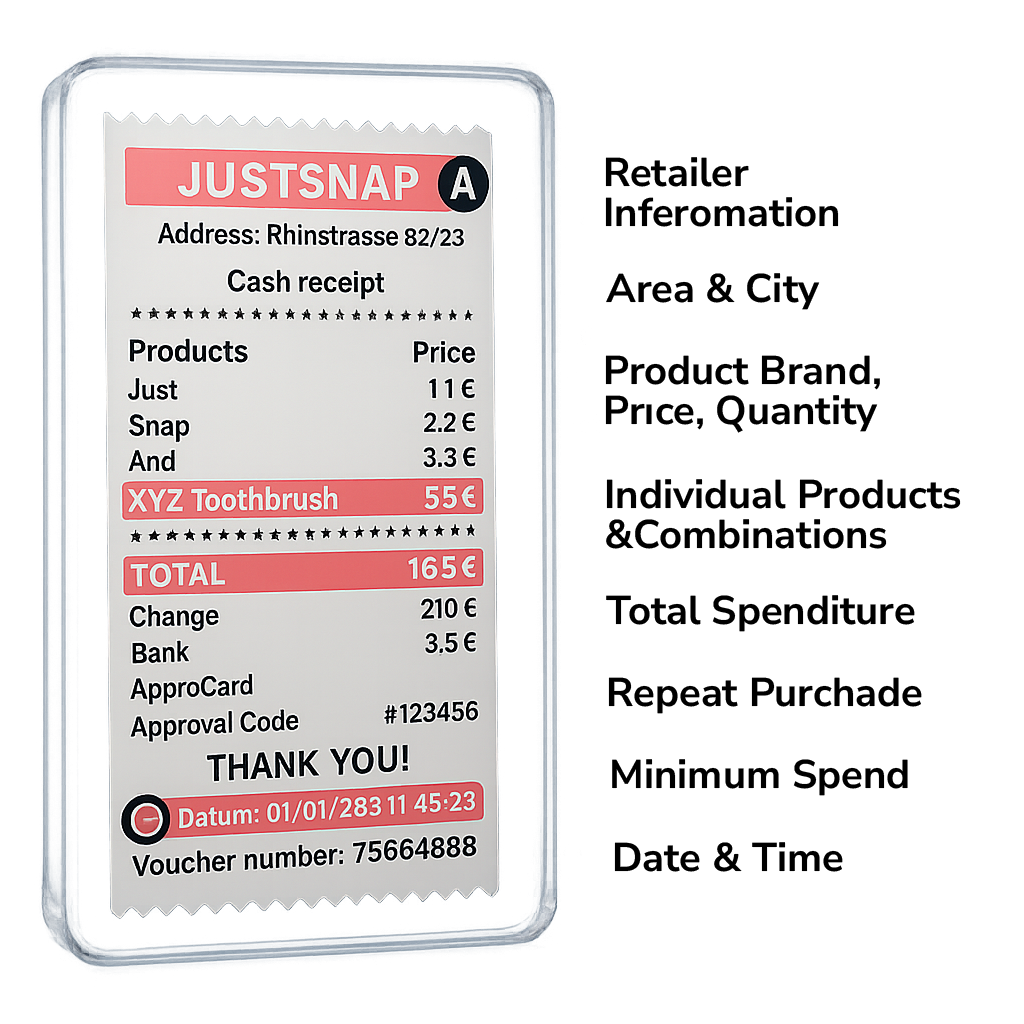 Justsnap’in yapay zekâ destekli OCR teknolojisi, güvenli bir API üzerinden fiş bazlı kampanya katılımlarını otomatikleştirerek geleneksel promosyonları modernleştirir. Perakendeci adı, satın alma tarihi ve ürün bilgileri gibi temel detayları SKU seviyesinde yüksek doğrulukla çıkarır ve GDPR uyumlu veri işleme sağlar. Her bir katılım, kampanya koşullarına göre otomatik olarak doğrulanır; böylece anında cashback veya dijital ödüller tetiklenir, sahtecilik ve manuel iş yükü en aza indirilir.